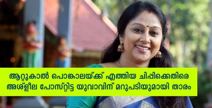 ആറ്റുകാൽ പൊങ്കാലയിൽ എന്നും നിര സാന്നിധ്യം ആയി നിൽക്കുന്ന താരമാണ് ചിപ്പി. കഴിഞ്ഞ ദിവസം ആയിരുന്നു പൊങ്കാല. സിനിമാതാരം ചിപ്പിയ്ക്കെതിരെ മോശമായ രീതിയിൽ സമൂഹ മാധ്യമങ്ങളിൽ പോസ്റ്റുകൾ പ്രചരിപ്പിക്കുകയും പരിഹസിക്കുകയും അവഹേളിക്കുകയും ചെയ്ത സംഭവത്തിൽ മറുപടിയുമായി നടി ചിപ്പി രംഗത്ത്.