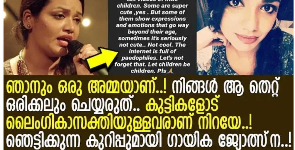 സമൂഹ മാധ്യമങ്ങളിൽ കുഞ്ഞുങ്ങളുടെ ഫോട്ടോകളും വിഡിയോകളും ഷെയർ ചെയ്യുന്നത് ആസ്പദം ആക്കിയാണ് ജ്യോത്സ്ന രാധാകൃഷ്ണൻ പോസ്റ്റ് ഇട്ടിരിക്കുന്നത്. കുട്ടികളുടെ ടിക് ടോക് വിഡിയോകൾ അടക്കം സാമൂഹിക മാധ്യമങ്ങളിൽ പങ്കുവെക്കുന്നത് കൗതുകകരമായി തോന്നുന്നു എങ്കിൽ കൂടിയും അത് അത്ര നല്ല കാര്യം അല്ല എന്ന് ഗായിക പറയുന്നു. സോഷ്യൽ മീഡിയ നിറയെ കുട്ടികളോട് ലൈംഗീക ആസക്തി ഉള്ള ആളുകൾ ആണ്. താരത്തിന്റെ ഫേസ്ബുക് പോസ്റ്റിന്റെ പൂർണ്ണ രൂപം ഇങ്ങനെ ആണ്..