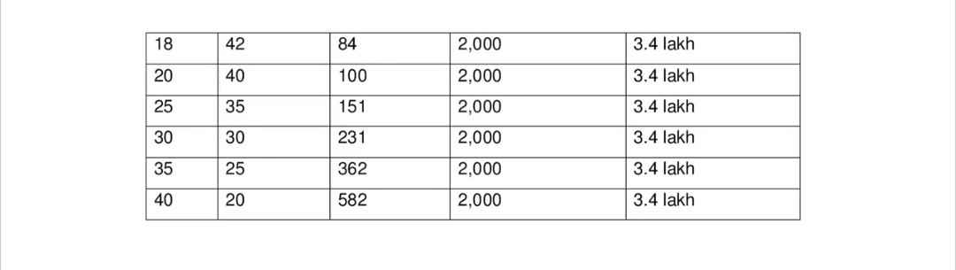 30 വയസ്സ് ഉള്ള ആൾ 116 രൂപ 30 വർഷം 35 വയസ്സ് ഉള്ളയാൾ 181 രൂപ 25 വർഷം 40 വയസ്സ് ഉള്ള ആൾ 20 വർഷം 291 രൂപ മാസം അടക്കണം. 2000 രൂപയാണ് മാസം കിട്ടേണ്ടത് എങ്കിൽ ഇങ്ങനെ മാസം അടക്കണം. 3000 കിട്ടണം എങ്കിൽ ഈ ടേബിൾ പ്രകാരം ഉള്ള തുക മാസം അടക്കണം.