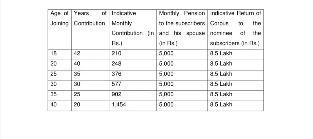 നമ്മൾ മാസത്തിൽ അടക്കുന്ന തുകയുടെ അടിസ്ഥാനത്തിൽ ആണ് നമുക്ക് 60 വയസിനു ശേഷം പെൻഷൻ ലഭിക്കുക. 18 വയസ്സ് ഉള്ള ഒരാൾ മാസം 42 രൂപ വെച്ച് 42 വർഷം അടക്കുന്ന എങ്കിൽ 60 വയസിനു ശേഷം നമുക്ക് 1000 രൂപ വെച്ച് പെൻഷൻ ലഭിക്കും. തുടർന്ന് നമ്മൾ മരിക്കുക ആണെങ്കിൽ നമ്മുടെ പങ്കാളിക്ക് ഈ തുക തുടർന്ന് പെൻഷൻ ലഭിക്കുകയും അയാളുടെ കാലശേഷം നോമിനിക്ക് 170000 രൂപ ലഭിക്കുകയും ചെയ്യുന്നതാണ് പദ്ധതി.
