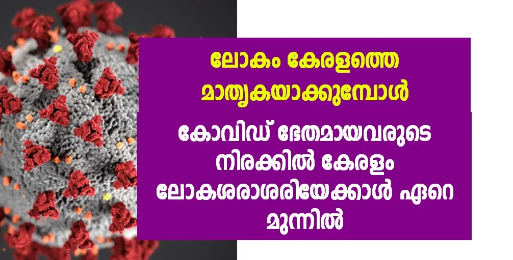കോറോണയെ തുരത്തുന്നതിൽ കേരളത്തിന്റെ യുദ്ധം വിജയത്തിലേക്ക്. ആദ്യ രോഗ ബാധ റിപ്പോർട്ട് ചെയ്തു 70 ദിവസങ്ങൾ പിന്നിടുമ്പോൾ രോഗം മുക്തരായവരുടെ എന്നതിൽ ലോക ശരാശരിയേക്കാൾ മുന്നിൽ ആണ് കേരളം. സംസ്ഥാനത്ത് കോവിഡ് സ്ഥിരീകരിച്ചവരിൽ 27.17 ശതമാനം പേരും രോഗമുക്തരായി. ഭേതമായവരുടെ കണക്കിൽ ലോക ശരാശരി 22.2 ആണ്.