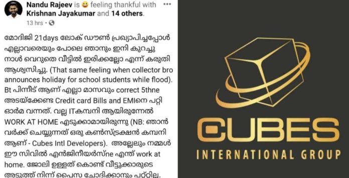 എന്നാൽ സിവിൽ എൻജിനീയർമാർക്ക് എന്ത് വർക്ക് ഫ്രം ഹോം? ഒരു കൺസ്ട്രക്ഷൻ കമ്പനിയിൽ ആണ് നന്ദു രാജീവ് പ്രവർത്തിക്കുന്നത്. ക്യൂബ്സ് ഇന്റർനാഷണൽ ഡെവലപ്പേഴ്സ് എന്ന സ്ഥാപനത്തിൽ ആണ് ഇദ്ദേഹം ജോലി ചെയ്യുന്നത്. ഈ സാഹചര്യത്തിലാണ് നന്ദുവിനെ അമ്പരപ്പിച്ചുകൊണ്ട് ഫോണിലേക്ക് ആ സന്ദേശം എത്തുന്നത്. അടുത്ത മാസത്തേക്കുള്ള സാലറി ഈ മാസം തന്നെ അക്കൗണ്ടിലേക്ക് ക്രെഡിറ്റ് ആയിരിക്കുന്നു. കൂടെ ക്യൂബ്സ് ഇന്റർനാഷണൽ കമ്പനിയിൽ നിന്നും ഒരു സന്ദേശവും – “ഏതു പ്രതിസന്ധി ഘട്ടത്തിലും ഞങ്ങൾ നിങ്ങളുടെ കൂടെ ഉണ്ടാകും. ഈ നാളുകൾ നിങ്ങൾ ഉചിതമായി വിനിയോഗിക്കും എന്ന് പ്രത്യാശിക്കുന്നു.’