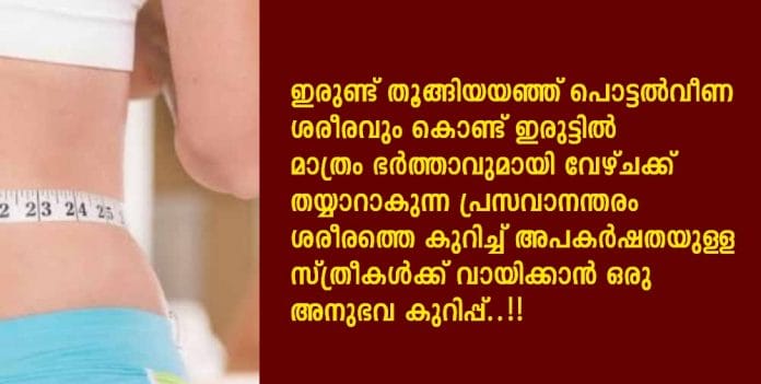 ഇരുണ്ട് തൂങ്ങിയയഞ്ഞ് പൊട്ടല്‍വീണ ശരീരവും കൊണ്ട് ഇരുട്ടില്‍ മാത്രം ഭര്‍ത്താവുമായി വേഴ്ചക്ക് തയ്യാറാകുന്ന പ്രസവാനന്തരം ശരീരത്തെ കുറിച്ച് അപകര്‍ഷതയുള്ള സ്ത്രീകള്‍ക്ക് വായിക്കാന്‍ ഒരു അനുഭവ കുറിപ്പ്..!!