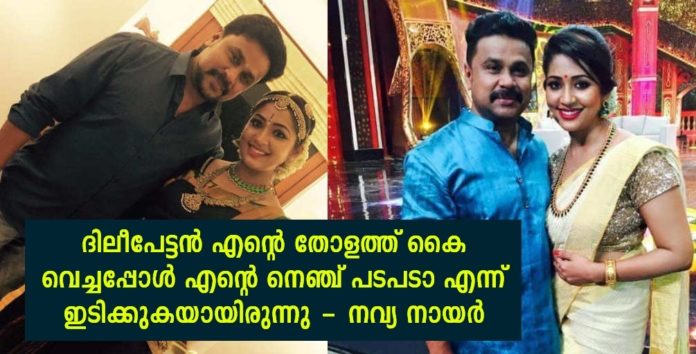 നാട്ടിന്പുറത്തൊക്കെ വളര്ന്ന ആ ഒരു പ്രായത്തിലുള്ള ഒരു പെണ്കുട്ടി ഭയങ്കരമായി പരിഭ്രമിച്ചുപോകുന്ന നിമിഷമാണത്. എന്റെ നെഞ്ചിടിപ്പിന്റെ ശബ്ദം തോളത്ത് കൈവച്ചിരിക്കുന്ന ആ മനുഷ്യന് തിരിച്ചറിഞ്ഞെന്ന് തോന്നുന്നു. ദിലീപേട്ടന് പറഞ്ഞു മോള് പേടിക്കേണ്ട കേട്ടോ. ഞങ്ങള് ഒന്നും ചെയ്യില്ല. നമ്മള് എല്ലാവരും ഇനി ഒന്നായിട്ട് വര്ക്ക് ചെയ്യാന് പോവുകയാണ് ആ വാക്കുകളിലുള്ള പരിഗണനയും പിന്തുണയും എനിക്കൊരിക്കലും മറക്കാനാവില്ല നവ്യ പറയുന്നു.