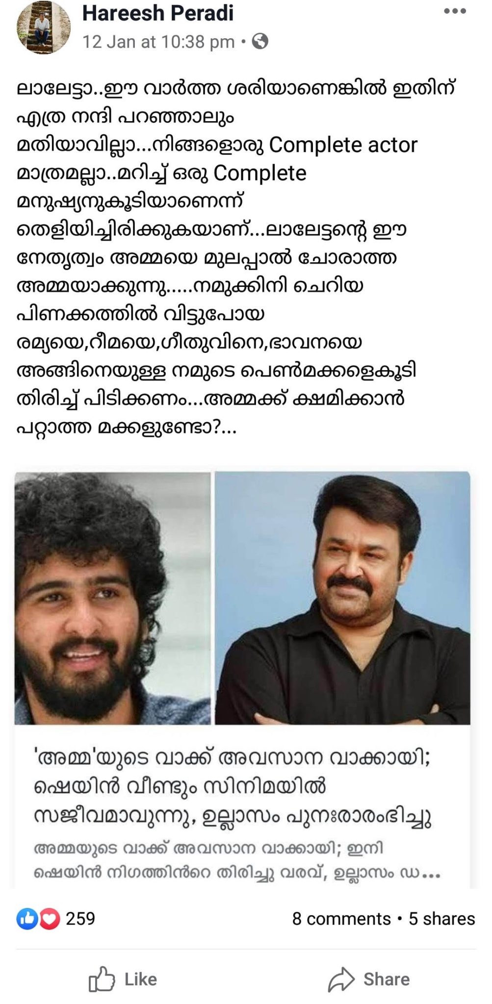 മോഹൻലാലിനെ അഭിനന്ദിച്ചു നടൻ ഹരീഷ് പേരാടി രംഗത്ത്. യുവ നടൻ ഷെയ്ൻ നിഗവും പ്രൊഡ്യൂസഴ്സ് അസോസിയേഷനും തമ്മിൽ ഉണ്ടായ തർക്കങ്ങൾ രമ്യമായി പരിഹരിച്ചതോടെയാണ് ഹരീഷ് പേരാടി അഭിനന്ദനങ്ങൾ ആയി എത്തിയത്. അമ്മ എന്ന താര സംഘടനയുടെ സമയോചിതമായ ഇടപെടലുകൾ ആണ് മോഹൻലാലിലൂടെ നടക്കുന്നത് എന്നാണ് ഹരീഷ് പേരാടി പറയുന്നത്. അദ്ദേഹത്തിന്റെ പോസ്റ്റിന്റെ പൂർണ്ണ രൂപം ഇങ്ങനെ,