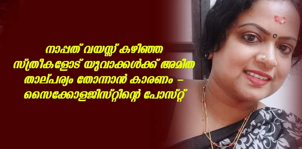 യുവാക്കൾക്ക് തന്റെ പ്രായത്തിൽ ഉള്ള പങ്കാളിയെക്കാൾ കൂടുതൽ ഇഷ്ടം പ്രായത്തിൽ ഒത്തിരി അധികം കൂടുതൽ ഉള്ള ആളുകളുമായി തോന്നാറുണ്ട്. ലൈംഗീക സുഖങ്ങൾക്ക് അപ്പുറം അവരുടെ കരുതലും ലാളനയും എല്ലാം യുവാക്കൾക്ക് ഇഷ്ടം കൂടുതൽ ഉണ്ടാകും. എന്നിരുന്നാൽ കൂടിയും എന്ത് കൊണ്ട് ആയിരിക്കും നാപ്പത് കഴിഞ്ഞ സ്ത്രീകളോട് യുവാക്കൾക്ക് അമിതമായ ഇഷ്ടവും താല്പര്യവും തോന്നുന്നതെന്നു കൗസിലിംഗ് സൈക്കോളജിസ്റ് കല ഷിബു കാരണങ്ങൾ നിരത്തി പറയുന്നു. കുറിപ്പ് ഇങ്ങനെ..
