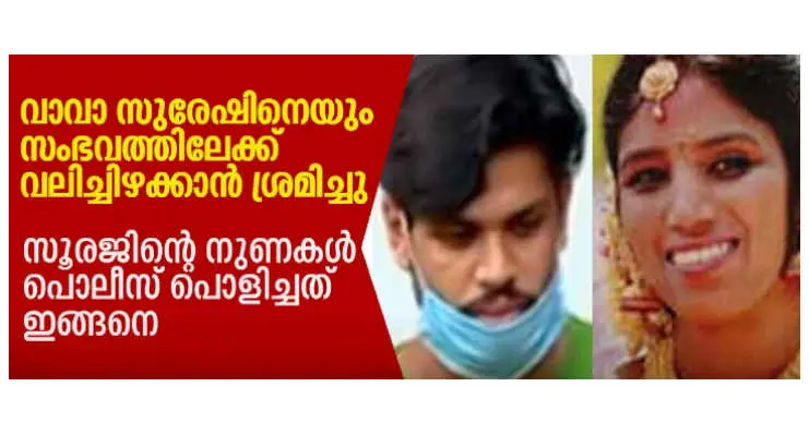 പ്രദേശത്ത് കാണാത്തയിനം പാമ്പിനെ ഉപയോഗിച്ചാണ് സൂരജ് കൃത്യം നടത്തിയതെന്നു സ്ഥിരീകരിച്ചിട്ടുണ്ട്. പാമ്പിനെ കൈമാറിയതിനു സാക്ഷികള് ഉണ്ട്. സൂരജിന് അണലിയെ നല്കാന് അംബാസഡര് കാറില് എത്തിയ സുരേഷിനൊപ്പം മൂന്ന് പേര് കൂടി ഉണ്ടായിരുന്നതായി പൊലീസ് സ്ഥിരീകരിച്ചു. വന്യജീവികളോട് അറപ്പും വെറുപ്പുമാണെന്നായിരുന്നു ആദ്യ മൊഴി. പാമ്പുപിടുത്തക്കാരന് സുരേഷുമായി പൊലീസ് എത്തിയപ്പോള് വീണ്ടും മൊഴി മാറ്റി.