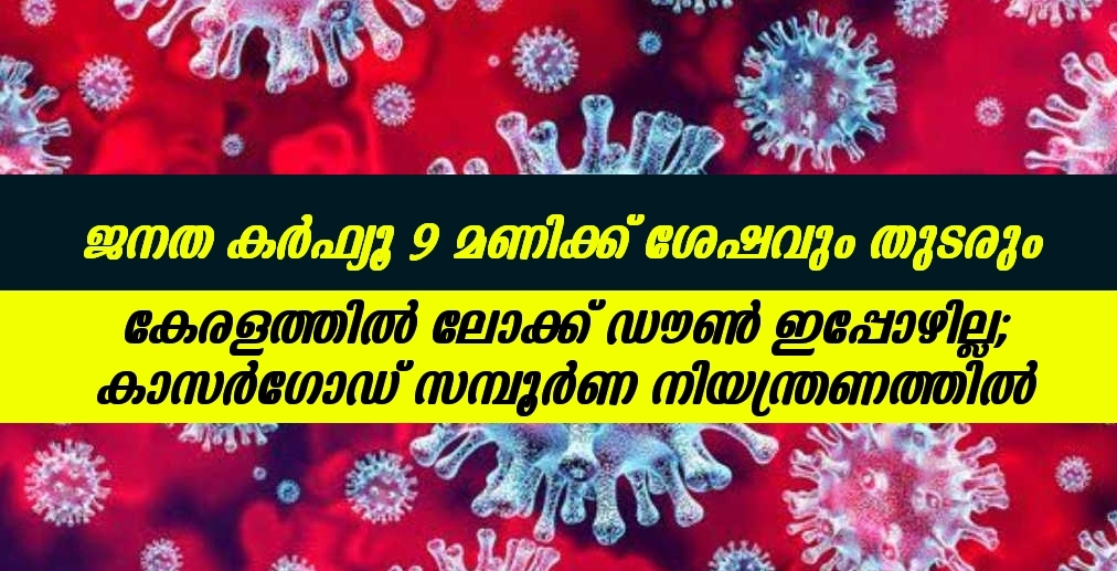 എന്നാൽ കാസർഗോഡ് പൊതു ഗതാഗതം അടക്കം പൂർണ്ണമായും ഒഴുവാക്കി. സംസ്ഥാനത്ത് ജനത കർഫ്യൂ 9 മണിക്ക് അവസാനിക്കില്ല. അതിനു ശേഷവും തുടരും. സംസ്ഥാനത്ത് 9 ജില്ലകളിൽ കോവിഡ് ബാധിതർ ഉണ്ടെന്നു ചീഫ് സെക്രട്ടറി.
