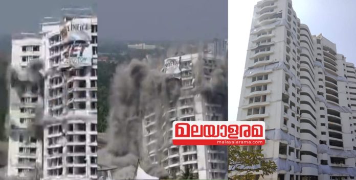 സുപ്രീം കോടതി വിധിയിൽ മരട് ഫ്‌ലാറ്റ് തകർന്നു വീണു. തടസ്സങ്ങൾ ഒന്നും ഇല്ലാതെ തകർന്നു വീണിരിക്കുന്നു. നിസാര സെക്കന്റുകൾക്ക് ഉള്ളിൽ ആണ് പൂർണ്ണമായും നിലം പതിച്ചിരിക്കുന്നു. ആദ്യ ടവർ ആണ് ആദ്യം തകർന്ന് വീണത്. ഇനിയും രണ്ടെണ്ണം കൂടി തകരാൻ ഉണ്ട്. 60 മീറ്ററോളം ആയിരുന്നു H2O ഫ്‌ളാറ്റിന്റെ ഉയരം. 11.18 ന് ആയിരുന്നു തകർന്നത്.