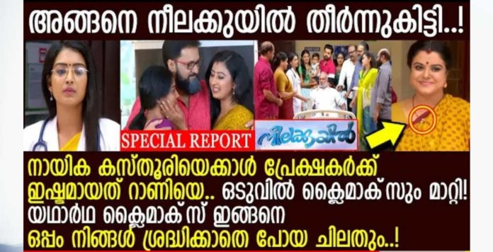 2018 ൽ ഏഷ്യാനെറ്റിൽ ആരംഭിച്ച സീരിയൽ ആണ് നീലക്കുയിൽ. രണ്ടു വർഷങ്ങൾക്ക് ഇപ്പുറം സീരിയൽ ഇന്നലെ അവസാനിച്ചിരിക്കുകയാണ്. പ്രേക്ഷകർ ആഗ്രഹിച്ച പോലെ ഉള്ള ഒരു ക്ലൈമാക്സ് തന്നെയാണ് കിട്ടിയതും. ടിആർപി റേറ്റിങ് മുൻപന്തിയിൽ ആയിരുന്നു ഈ പരമ്പര. ആദിയുടെയും ഭാര്യ റാണിയുടേയും ആദി അബദ്ധത്തിൽ വിവാഹം കഴിച്ച കസ്തൂരിയുടെയും ത്രികോണ പ്രണയ കഥ ആണ് സീരിയലിൽ ഉള്ളത്.