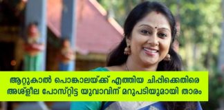 ആറ്റുകാൽ പൊങ്കാലയ്ക്ക് എത്തിയ ചിപ്പിക്കെതിരെ അശ്ളീല പോസ്റ്റിട്ട യുവാവിന് മറുപടിയുമായി താരം..!!