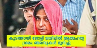 കൂടത്തായി കേസിലെ മുഖ്യപ്രതി ജോളി ജയിലിൽ ഞരമ്പുകൾ മുറിച്ച് ആത്മഹത്യക്ക് ശ്രമിച്ചു..!!