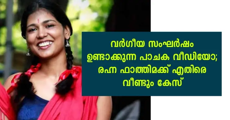 വർഗീയ വിദ്വേഷം ഉണ്ടാക്കുന്ന പോസ്റ്റ് ഉണ്ടാക്കിയതിന് വീണ്ടും രഹ്ന ഫാത്തിമക്ക് എതിരെ കേസ്. മത വികാരം വ്രണപ്പെടുത്തിയ കേസിൽ ജാമ്യം നേടിയ രഹ്നക്ക് ആണ് വീണ്ടും പുതിയ കേസ് വന്നിരിക്കുന്നത്. യൂട്യൂബ് ചാനലിലെ പാചക പരിപാടിയിൽ വർഗീയ വിദ്വേഷം ഉണ്ടാക്കിയ വീഡിയോ താരം പോസ്റ്റ് ചെയ്തത്. എറണാകുളം സ്വദേശി അഡ്വ. രജീഷ് രാമചന്ദ്രൻ എറണാകുളം സൗത്ത് പോലീസ് സ്റ്റേഷനിൽ നൽകി പരിപാടിയിൽ പോലീസ് എഫ് ഐ ആർ എടുത്തു.