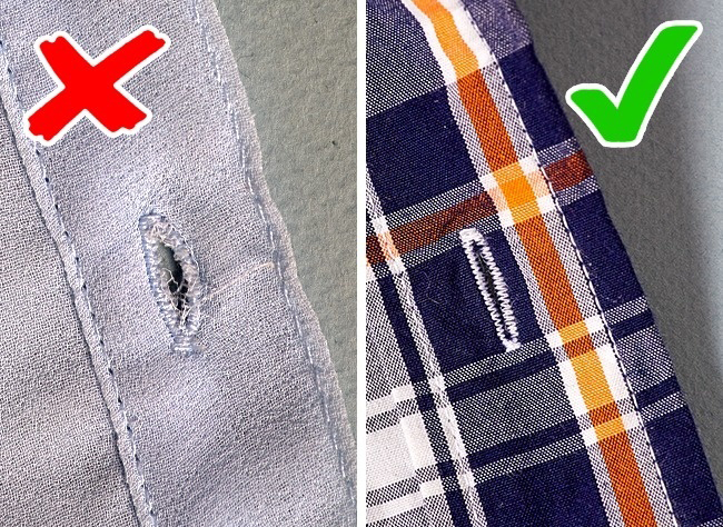When manufacturers make a fake or low-quality item, they often don’t pay attention to little details. That is why you should examine buttons and buttonholes before buying an item. Make sure that buttons are secured and no threads are sticking out. The holes should be neatly overlocked and evenly cut through.