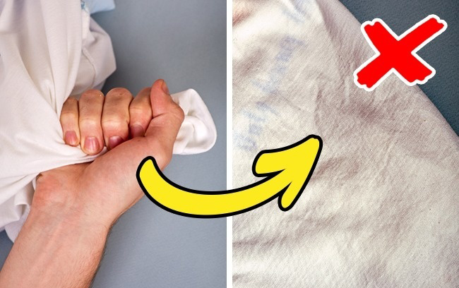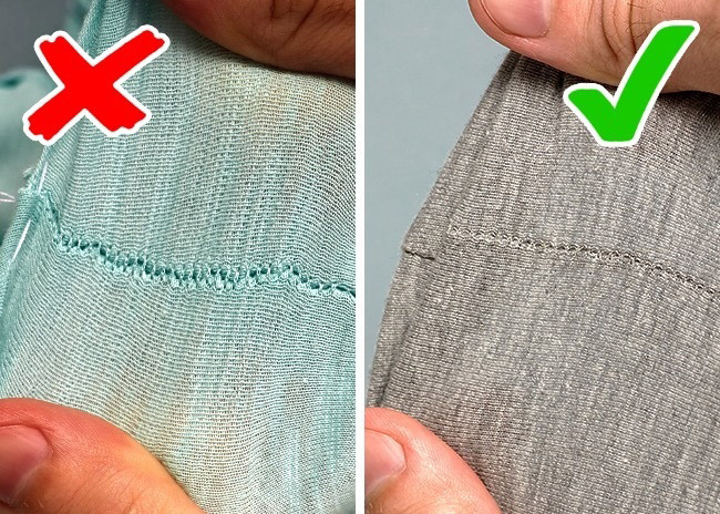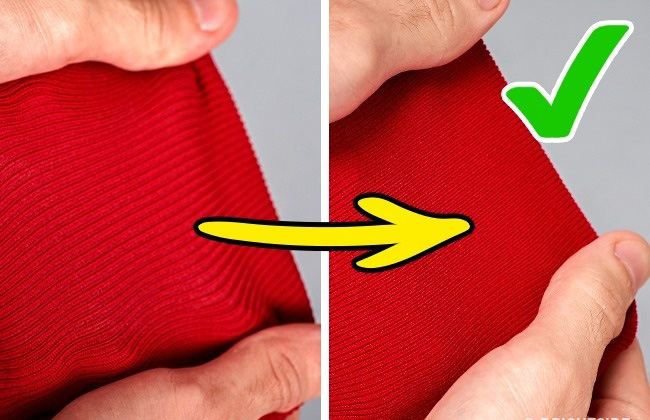 Grab some fabric, and squeeze it tightly in your fist for a few seconds. If the fabric looks like crumpled paper after this, it means it has been treated with a special agent to keep its shape. Such clothes will start looking like a rug after the first wash.