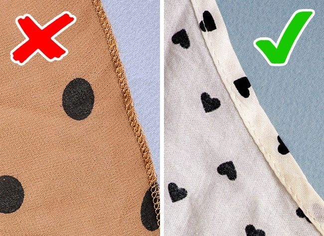 Pants and skirts should have a hem of up to 4 cm. Blouses and shirts can do with a smaller one of about 2 cm. If there’s no hem or this place is simply stitched, you are likely looking at a low-quality item.