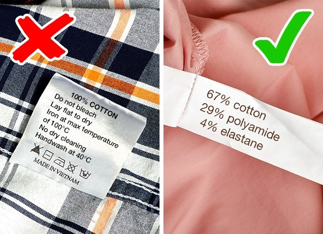 Natural fabrics, such as cotton, silk, and wool, are strong and more durable than synthetics. However, 100% cotton can quickly shrink after washing. That is why it is a good idea to choose clothes with an addition (5-30%) of artificial fabrics (viscose, polyester, nylon, etc). These clothes won’t stretch out and will serve you much longer.