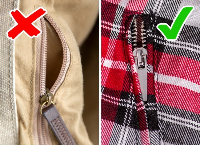 Make sure to buy clothes and accessories with metal zippers covered with a strap: they are the most reliable and long-lasting. Open plastic zippers often break and are a sign of poor quality in almost any item.