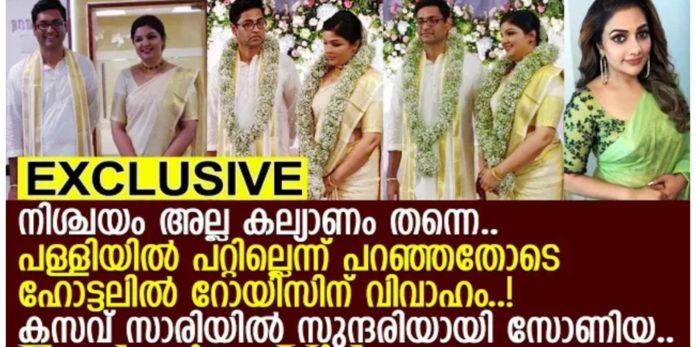 അത് സത്യാമാകുകയും ചെയ്തു. ഇന്ന് തൃശ്ശൂരിൽ വെച്ച് സോഫ്റ്റ്‌വെയർ എഞ്ചിനീയർ ആയ സോണിയയെ റോയ്‌സ് മിന്ന് ചാർത്തിയത്. റിമിയും ആയുള്ള വിവാഹ ബന്ധം നിയമപരമായി വേർപിരിഞ്ഞു എങ്കിൽ കൂടിയും പള്ളിയിൽ നിന്നും മതിയായ അനുവാദം ലഭിക്കാത്തത് കൊണ്ട് ഹോട്ടലിൽ വെച്ചായിരുന്നു വിവാഹം. വളരെ അടുത്ത ബന്ധുക്കളും സുഹൃത്തുക്കളും മാത്രം പങ്കെടുത്ത ചടങ്ങു ഹോട്ടൽ അശോക ഭവനിൽ വെച്ചായിരുന്നു.