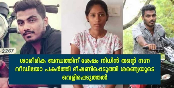 തന്റെ നഗ്ന ദൃശ്യങ്ങള് സോഷ്യല് മീഡിയ വഴി പ്രചരിപ്പിക്കുമെന്ന് നിധിന് ഭീഷണിപ്പെടുത്തിയിരുന്നതായി ശരണ്യ നേരത്തെ പൊലീസിന് മൊഴി നല്കിയിരുന്നു. ഇക്കാര്യവും നിധിനെ ചോദ്യം ചെയ്തപ്പോള് അന്വേഷണസംഘത്തിന് സ്ഥിരീകരണം ലഭിച്ചതായാണ് റിപ്പോര്ട്ട്. കണ്ണൂർ സിറ്റി പോലീസ് സർക്കിൾ ഇൻസ്പെക്ടർ ടി ആർ സതീശന്റെ നേതൃത്വത്തിൽ ആണ് അന്വേഷണം നടത്തുന്നത്.
