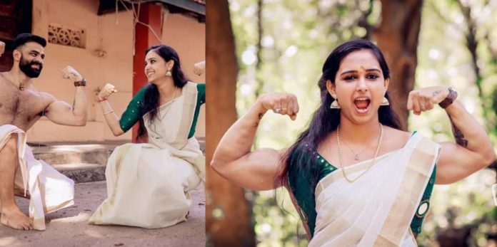 പക്ഷേ ഇവിടെയിതാ വിവാദങ്ങളിൽ നിന്നെല്ലാം ഒഴിഞ്ഞ് വേറിട്ടൊരു പ്രണയകഥ പങ്കുവയ്ക്കുകയാണ് വൈറൽ ജോഡി. ജിമ്മൻ ചെക്കനരികിൽ പ്രണയഭാവം വിതറിയെത്തുകയാണ് ഒരു കല്യാണ പെണ്ണ്. ഷർട്ടില്ലാതെ മസിൽ പെരുക്കിയെത്തുന്ന കല്യണ ചെക്കനാണ് ചിത്രത്തിലെ ഹൈലൈറ്റ്. ചെക്കന്റെ മസിൽപെരുക്കത്തിനൊപ്പം നാടൻ ലുക്കിൽ കല്യാണ പെണ്ണ് കൂടി എത്തുമ്പോള് സംഭവം ജോറാകുന്നു.