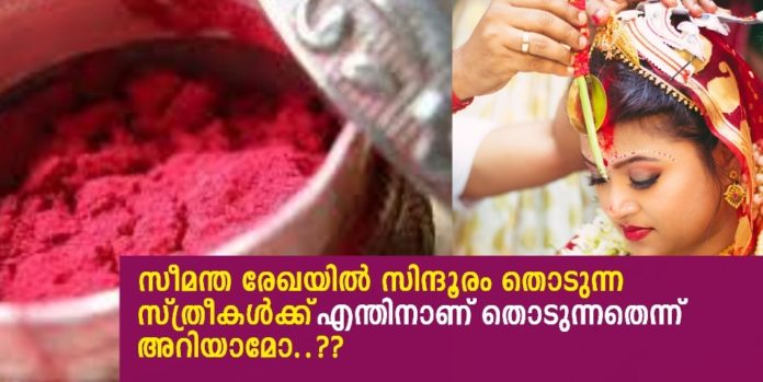ജീവിതത്തിൽ ഒരിക്കൽ എങ്കിലും എന്തിനാണ് സിന്ദൂരം ചാർത്തുന്നത് എന്ന് ചിന്തിക്കാത്ത സ്ത്രീകളും വിരളം ആയിരിക്കും എന്ന് വേണം പറയാൻ. ഇന്ത്യയിലെ സ്ത്രീകൾ ആണ് പൊതുവെ ഈ ആചാരം കണ്ടു വരുന്നത്. തലയിൽ മുടി രണ്ടായി വകഞ്ഞു മാറ്റി ഇരു പുരികത്തിനും നടുവിൽ ആയി മൂക്കിന് നേരെ നെറ്റിയുടെ മുകളിൽ മുടി തുടങ്ങുന്ന ഭാഗത്തായി ആണ് സിന്ദൂരം തൊടുന്നത്. എന്നാൽ ഇതിന്റെ ആഹാരം രണ്ടായി ആണ് പറയപ്പെടുന്നത്.