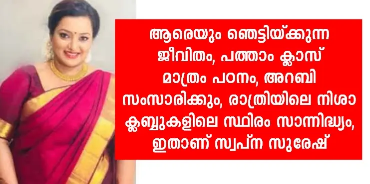 വിമാനത്താവള ജീവനക്കാരിയിൽ നിന്നും നയനന്ത്ര വിഭാഗത്തിലെ ഉന്നതരുമായുള്ള ബന്ധം വരെ നീളുന്ന സ്വപ്നയുടെ ജീവിതം അന്ത്യന്തം നാടകീയം. കോൺസുലേറ്റിൽ ജോലി ചെയ്യുമ്പോഴാണ് തലസ്ഥാനത്തെ ഉന്നതരുമായി ബന്ധം സ്ഥാപിക്കുന്നത്. നക്ഷത്ര ഹോട്ടലുകളിലെ പാർട്ടികളിൽ സ്ഥിരം സാന്നിധ്യമായി. നഗരത്തിൽ കോടികൾ ചെലവുവരുന്ന വീടിന്റെ നിർമാണം തുടങ്ങിയെന്നും വിവരമുണ്ട്.
