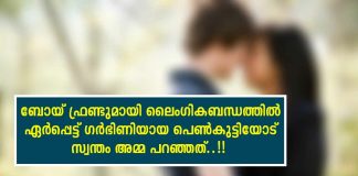 ബോയ് ഫ്രണ്ടുമായി ലൈംഗികബന്ധത്തില് ഏര്പ്പെട്ട് ഗര്ഭിണിയായ പെണ്കുട്ടിയോട് സ്വന്തം അമ്മ പറഞ്ഞത്..!!