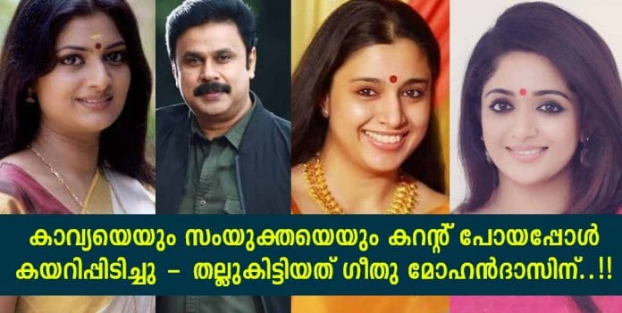 എന്നാൽ ഗാനം ചിത്രീകരണം നടത്തുന്നതിന് ഇടയിൽ വീണ്ടും കറണ്ട് പോയി. എന്നാൽ തൊട്ട് പുറകെ പടക്കം പൊട്ടുന്നത് പോലെ ഒരു ശബ്ദവും കേട്ടു. തന്നെ വീണ്ടും കയറി പിടിച്ച ആളുടെ മുഖം നോക്കി സംയുക്ത പൊട്ടിച്ചു. കറണ്ട് വന്നപ്പോൾ കവിൾ പൊത്തി പിടിച്ചു നിൽക്കുന്ന ഗീതു മോഹൻദാസിനെ ആണ് ലൊക്കേഷനിൽ ഉള്ളവർ കാണുന്നത്. രണ്ടു വട്ടവും കയറി പിടിച്ചത് ഗീതു മോഹൻദാസ് ആയിരുന്നു. അത് ലൊക്കേഷനിൽ എല്ലാവർക്കും ചിരിക്കാൻ ഉള്ള വകയും ആയി.