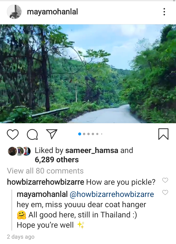 വിസ്മയയുടെ ഇന്സ്റ്റാഗ്രാം ചിത്രങ്ങള് അടങ്ങിയ പോസ്റ്റിന് താഴെ സുഹൃത്തിന്റെ ചോദ്യത്തിനാണ് വിസ്മയ മറുപടി കൊടുത്ത്. ‘ഇപ്പോഴും തായ്ലന്ഡിലാണ്. ഇവിടെ സുഖമായിരിക്കുന്നു’ എന്നാണ്.